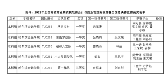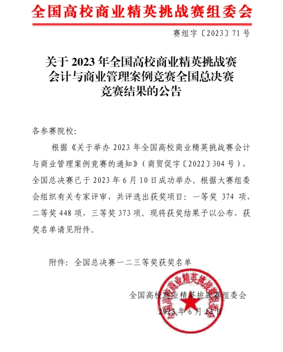 近日,由哈尔滨金融学院承办的2023年全国高校商业精英挑战赛会计与商业管理案例竞赛黑龙江省赛胜利闭幕。我院学生代表队在本届赛事中再创佳绩,喜获一等奖7项、二等奖4项、三等奖1项,合计12项的历届最优成绩。在6月10日进行的全国总决赛中,我院晋级国赛的5支参赛队伍,不负众望,又获得一等奖4项,三等奖1项的最佳战绩。