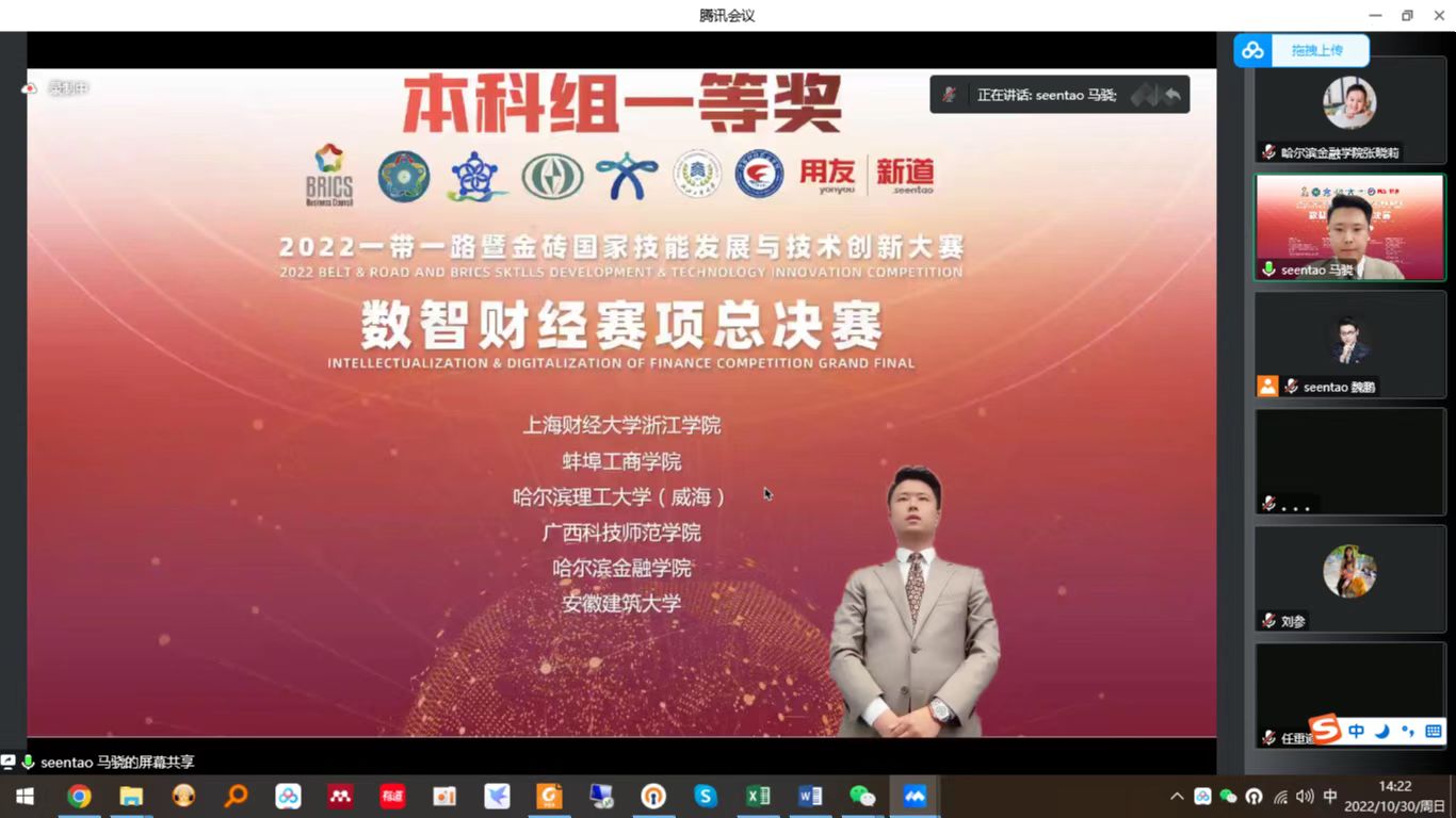 10月29日-30日,2022一带一路暨金砖国家技能发展与技术创新大赛数智财经赛项总决赛在线上成功落幕。来自全国29个省、市、自治区的67支本科队伍通过地区选拔赛成功晋级总决赛,由我校会计系张晓莉、高原老师指导的王文博、李嘉琪、刘洋、代双双4名学生组成参赛队伍成绩表现优异,获得全国总决赛一等奖。