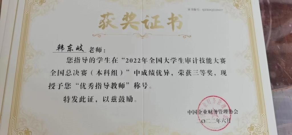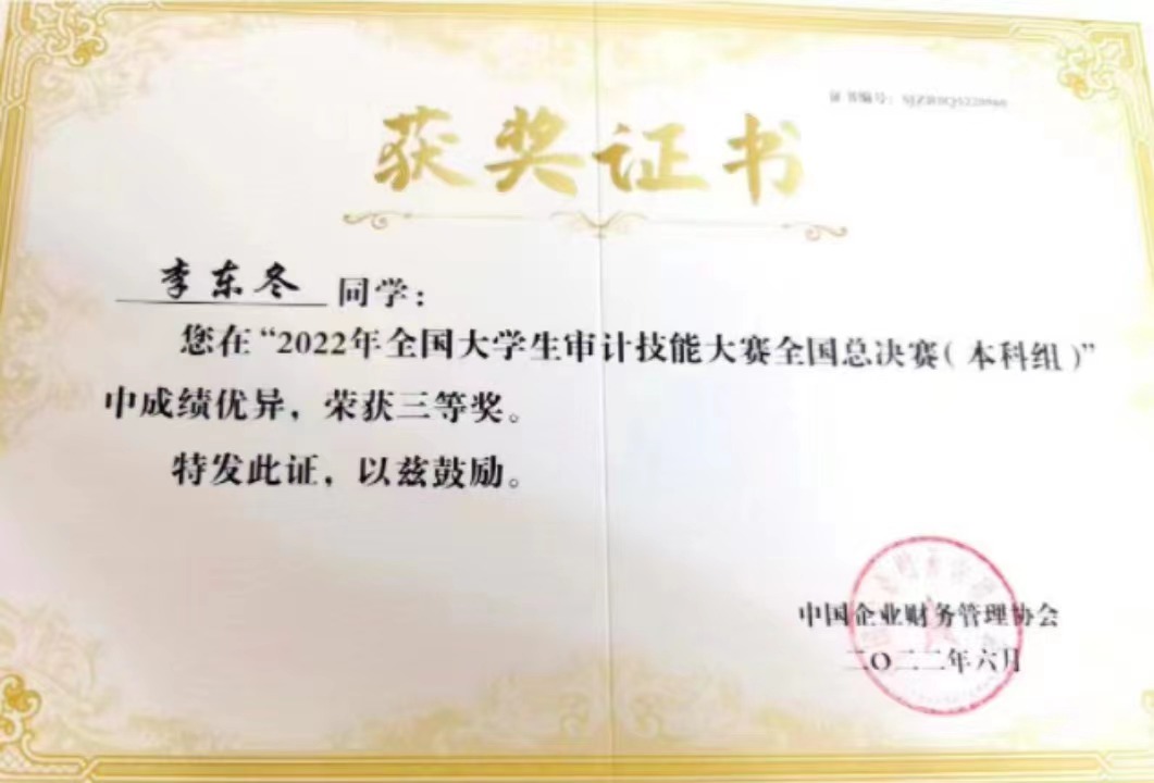 由中国企业财务管理协会主办 ,中兴财光华会计师事务所、中联集团教育科技有限公司承办的第一届全国大学生审计技能大赛于近日落下帷幕,来自包括首都经贸大学、北京工商大学、山西财经大学、哈尔滨金融学院等百余支国内本科院校团队,在历经区域赛与总决赛两个阶段比拼后,我校会计系李东冬、朱琳、张雨晗、安秀娜同学组成的代表队依次获得区域赛二等奖、国家赛三等奖的优异成绩,林丽、韩东岐老师获得优秀指导教师奖。
