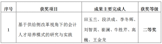 本次获奖成果展示了近年来学校在推进教育教学改革、优化专业建设、创新人才培养模式等方面所取得的阶段性进展和成效,是对学校教师积极投身教学改革研究与实践的充分肯定和鼓励,为学校和会计系培育更高层次教学成果奖奠定了良好基础。