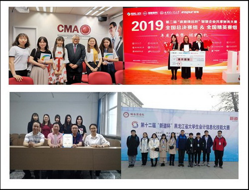 促进学科竞赛结硕果。将校企合作新道云财务实践教学基地向学生开放,为学生提高专业技能训练服务,结合实践教学体系为参与学科竞赛团队提供培训与训练支持,近一年获得“2019年海峡两岸及港澳地区大学生会计与商业管理案例竞赛”总冠军;第二届“浪潮铸远杯”智慧企业共享财务大赛全国总决赛一等奖;黑龙江省大学生会计信息化技能大赛一等奖等国家级、省级奖项多个。