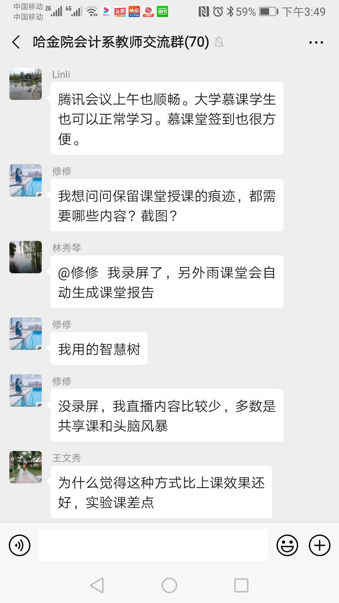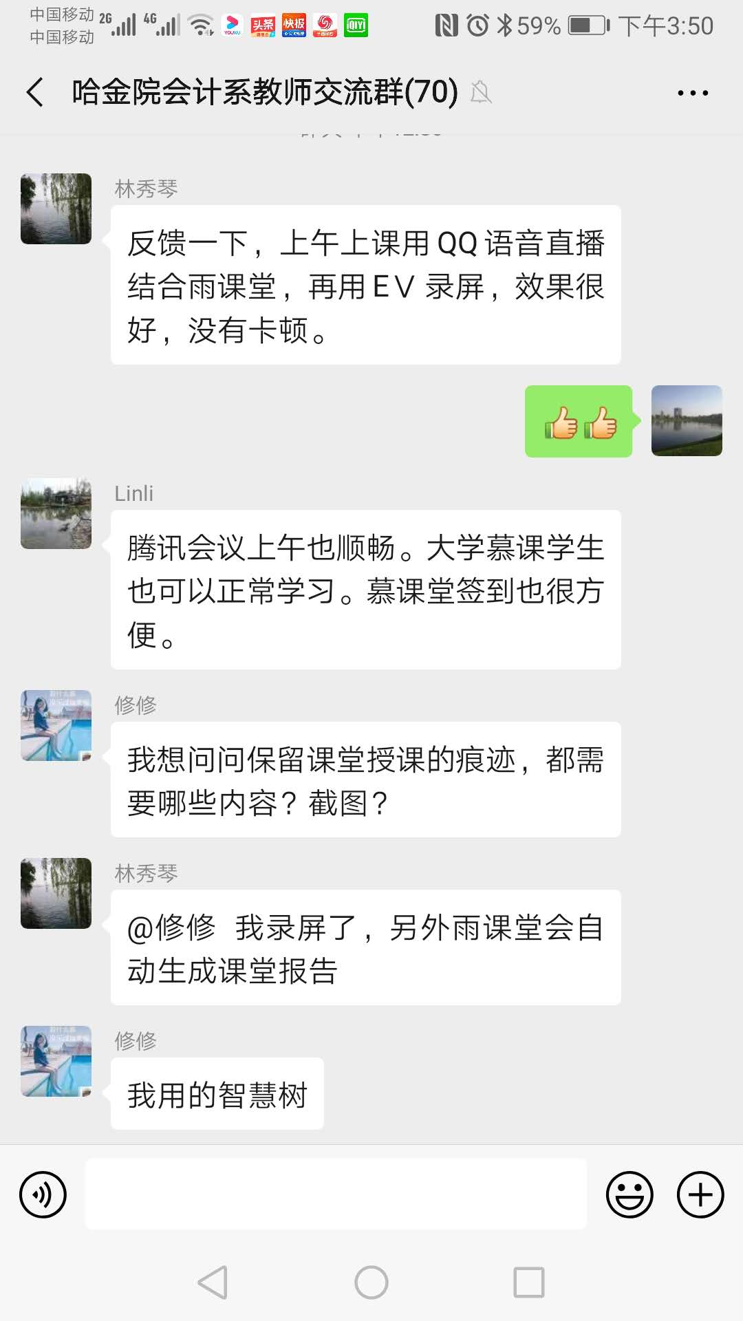 四、资产评估教研室从三个方面进行了全面准备工作。一是,教学文件如教学大纲、教学日历、教案、授课PPT(或讲义)、学生点名册等教学文件已更新、完善;直播的课程在教案上体现了线上授课教法与要求;二是,做到课前发放教材照片或讲义内容电子版;三是,教研室教师均已与所授课班级取得了联系,建立了相关的微信、QQ群,并进行了全员签到的测试;四是,进行授课前的相关软件使用技巧宣传,对于学生所使用的网络环境、终端设备的情况进行了问卷调查,充分了解授课的外部环境情况。