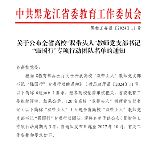 高校“双带头人”教师党支部书记“强国行”专项行动是教育部为深入贯彻落实党的教育方针,充分发挥高校“双带头人”的示范引领作用,推动高校党建工作和教育教学工作深度融合而开展的一项重要举措。我校党委高度重视教师党支部书记“双带头人”培育工作,推动党建工作与业务工作深度融合,充分发挥教师党支部政治功能、组织功能、服务功能,现已实现“双带头人”教师党支部书记全覆盖。