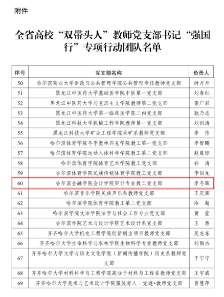 近日,省委教育工委公布了全省高校“双带头人”教师党支部书记“强国行”专项行动团队名单,我校会计学院审计专业教工党支部成功入选。这是我校基层党组织建设的一次新突破,也是学校以高质量党建保障高质量发展的重要体现。