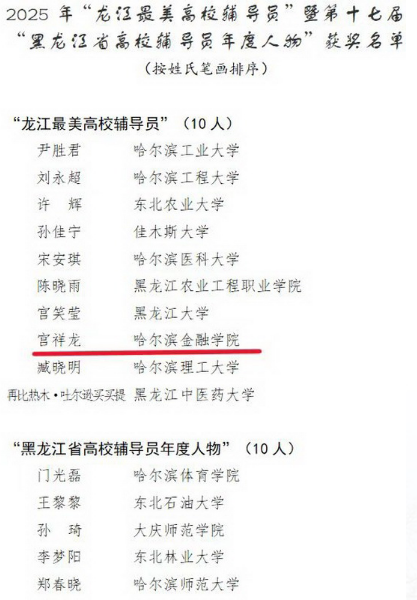 近日,2025年“龙江最美高校辅导员”暨第十七届“黑龙江省高校辅导员年度人物”推选展示活动结果正式揭晓。我校会计学院团委书记、辅导员宫祥龙老师荣获“龙江最美高校辅导员”称号,标志着我校在该项评选中取得新突破。