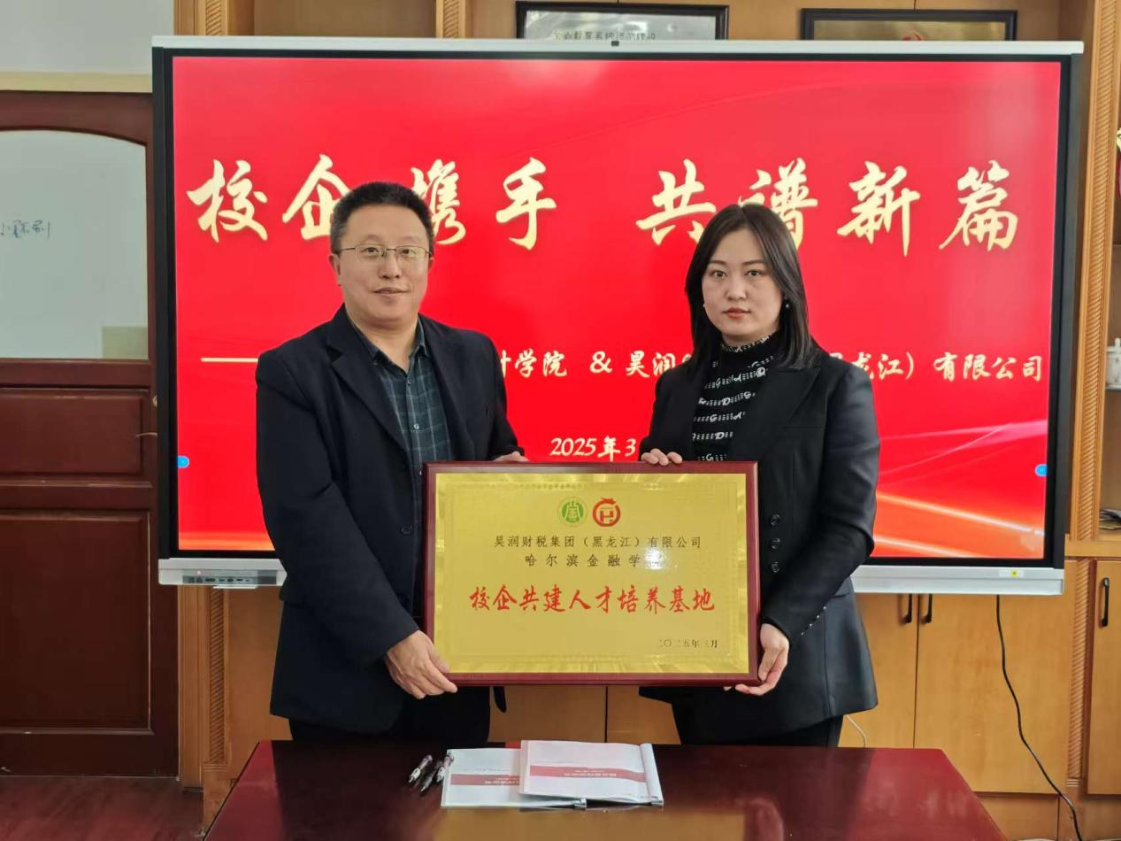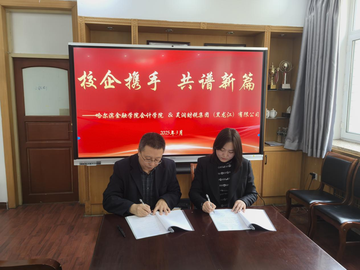 为深入推动产教融合、校企合作,促进教育链、人才链与产业链、创新链有机衔接,2025年3月20日,哈尔滨金融学院会计学院与昊润财税集团(黑龙江)有限公司校企合作签约仪式在会计楼310举行。会计学院院长段洪成、党总支副书记白永雪、昊润财税集团(黑龙江)有限公司总经理张晶晶出席签约仪式。