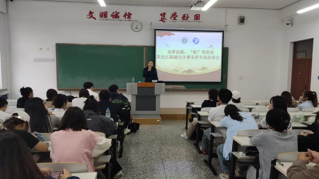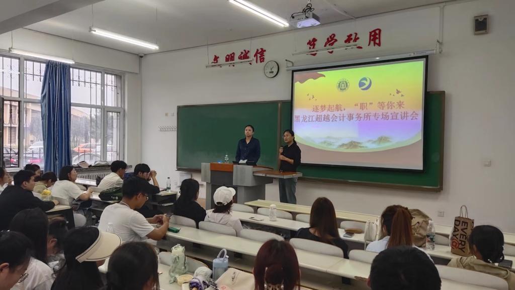 为了让同学们更好了解会计专业与实务的关系,明确未来就业方向,会计学院于9月4日下午在综合楼102举行了宣讲会。本次宣讲会由黑龙江超越会计事务所所长刘婷主讲,会计学院党总支副书记白永雪、毕业班辅导员秦东杰及2025届毕业生代表参加了此次宣讲会。