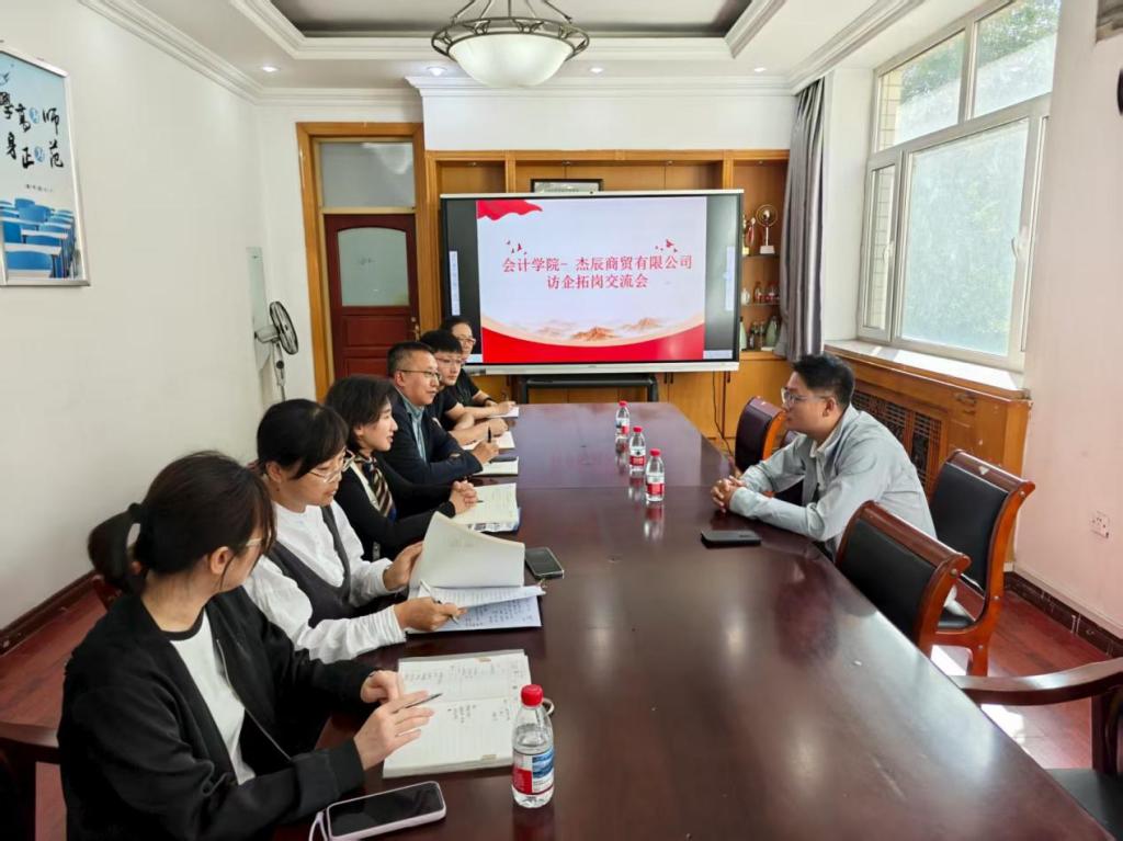 为拓宽会计学院学生就业渠道,深化校企合作,提升应用型会计人才培养与企业需求的契合度,将访企拓岗促就业专项行动走深走实,2025年9月19日,会计学院党总支书记闫慧兰、院长段洪成、党总支副书记白永雪以及毕业班辅导员与杰辰商贸有限公司黑蒙地区公司HR经理杨振芸,就学生就业、人才培养等事宜开展深入洽谈与交流。