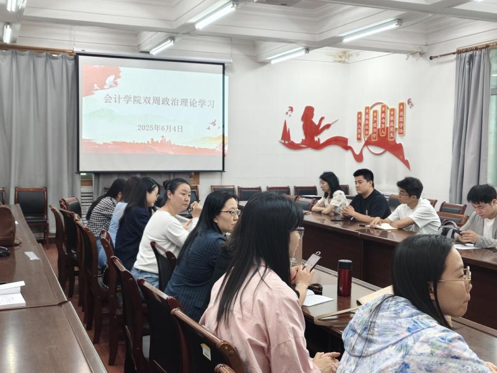 2025年6月4日下午 ,会计学院在会计楼309会议室开展双周政治理论学习,会议由党总支书记闫慧兰主持,全体教职工参加。