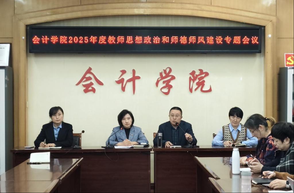 2025年4月2日下午,会计学院在会计楼309会议室召开2025年教师思想政治与师德师风建设专题会议,会议由院长段洪成主持,全院教职工参加。