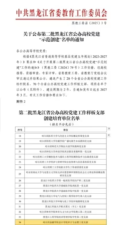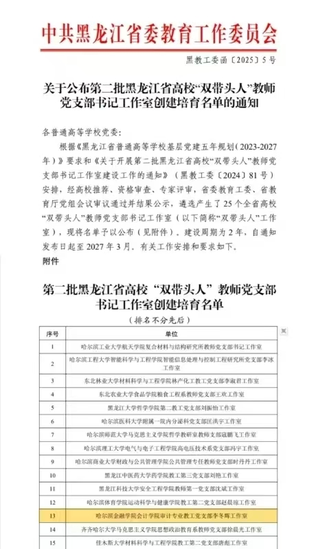 近日,省委教育工委公布了第二批黑龙江省公办高校党建“示范创建”评选结果,我院审计专业教工党支部获批第二批黑龙江省公办高校党建工作样板支部创建培育单位;同时,我院审计专业教工党支部李冬辉工作室获批第二批黑龙江省高校“双带头人”教师党支部书记工作室创建培育单位。