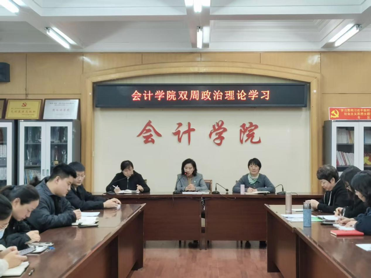 2025年11月5日,会计学院在会计楼309会议室组织开展双周政治理论学习,会议由党总支书记闫慧兰主持,全体教职工参加。