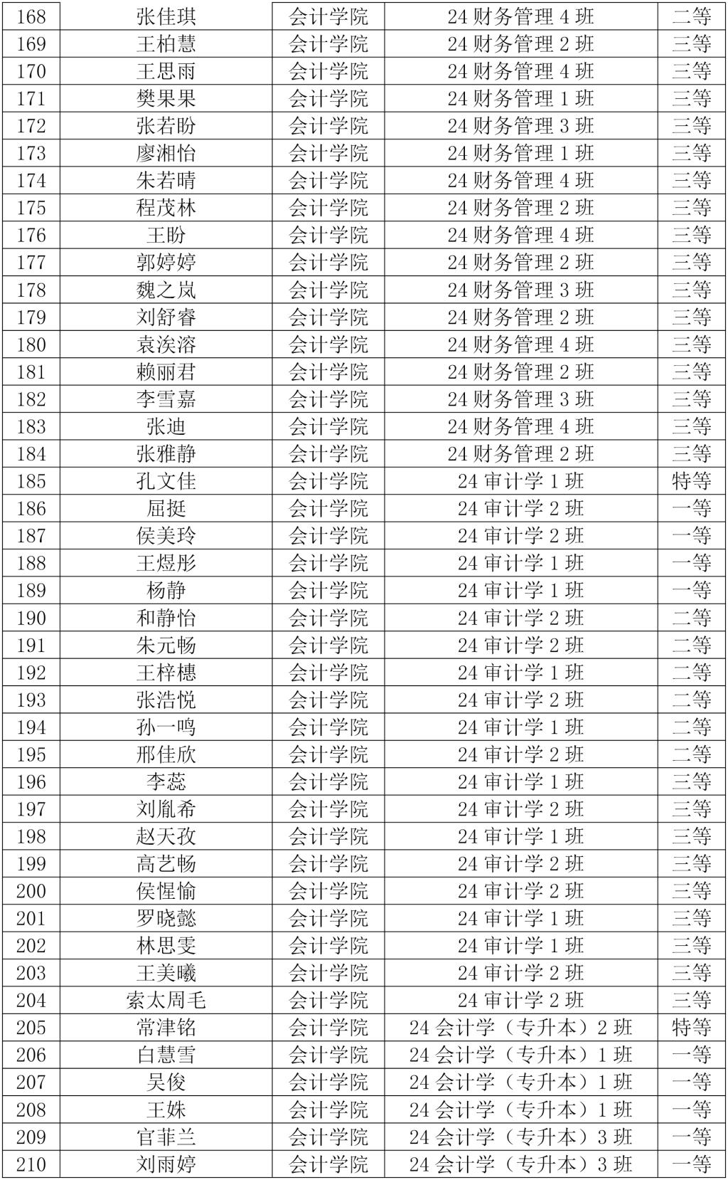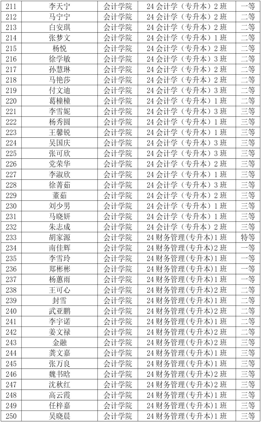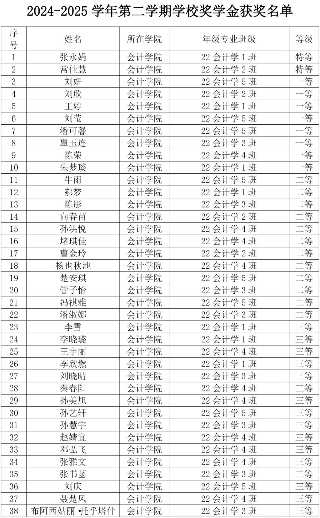根据《哈尔滨金融学院学生奖励办法》(哈金院【2020】27 号)文件要求和《关于评定2024-2025学年第二学期校奖学金》的通知,会计学院严格依据校奖学金评选办法及程序,坚持公平、公正、公开的原则,认真组织评选校奖学金。经学生本人申请、各专业评审推荐、学院评优工作小组复审,会计学院现将拟推荐250名2024-2025学年第二学期校奖学金获得者,名单公示如下。