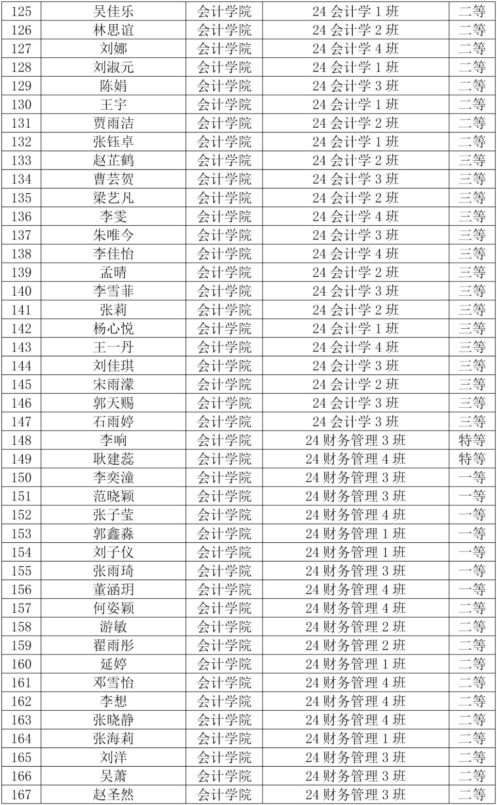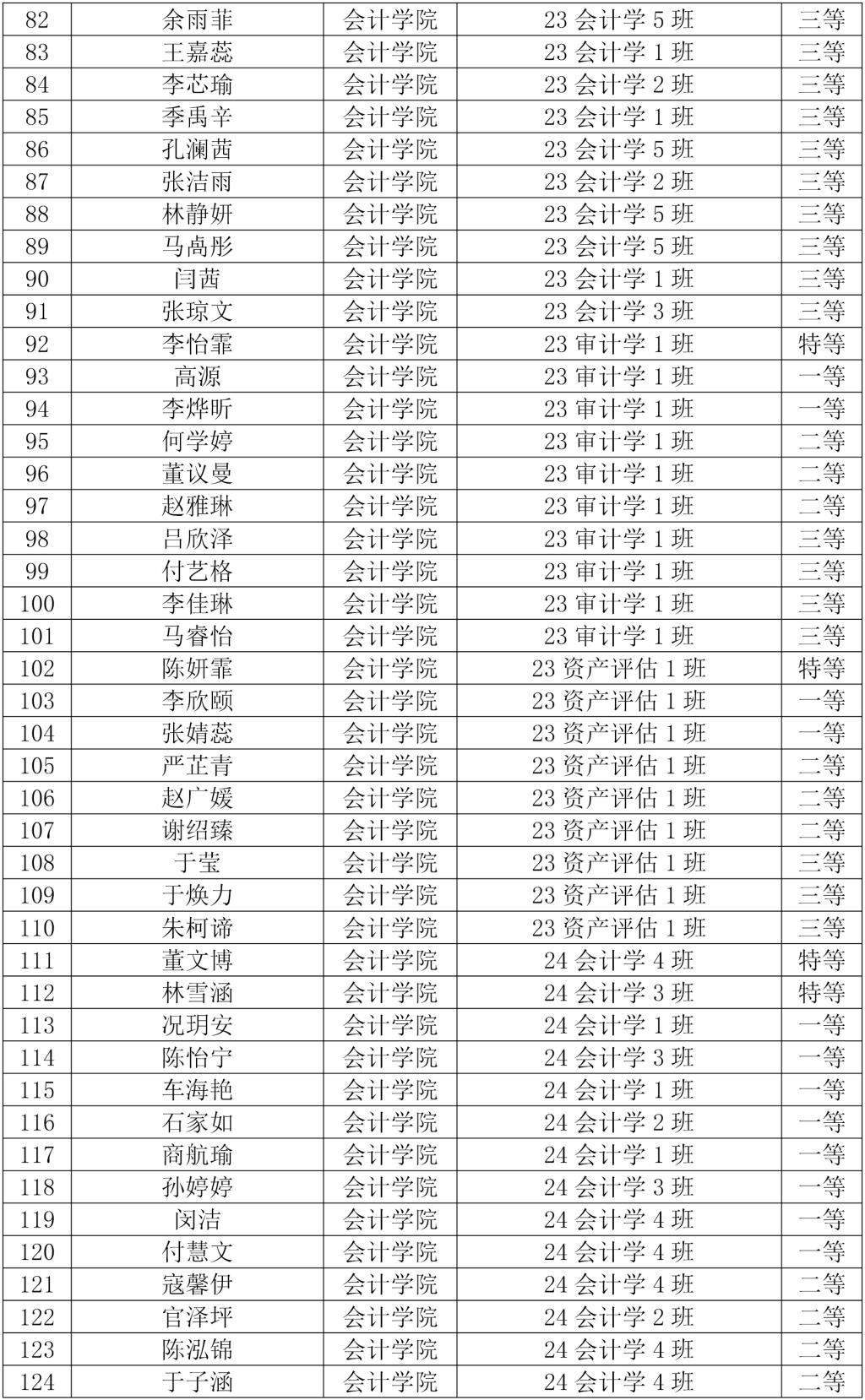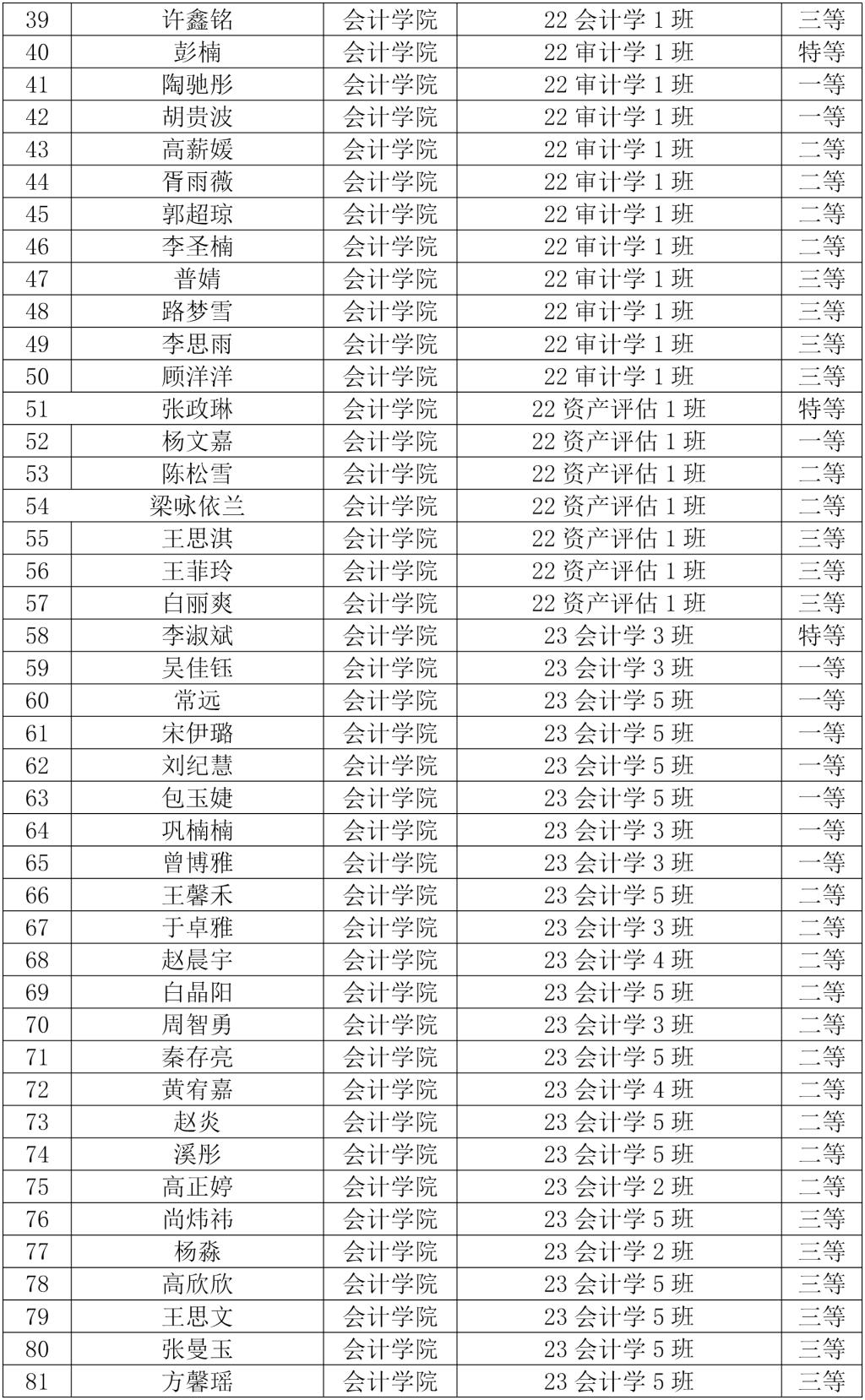 根据《哈尔滨金融学院学生奖励办法》(哈金院【2020】27 号)文件要求和《关于评定2024-2025学年第二学期校奖学金》的通知,会计学院严格依据校奖学金评选办法及程序,坚持公平、公正、公开的原则,认真组织评选校奖学金。经学生本人申请、各专业评审推荐、学院评优工作小组复审,会计学院现将拟推荐250名2024-2025学年第二学期校奖学金获得者,名单公示如下。