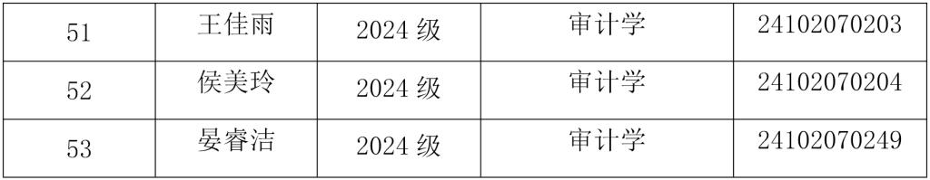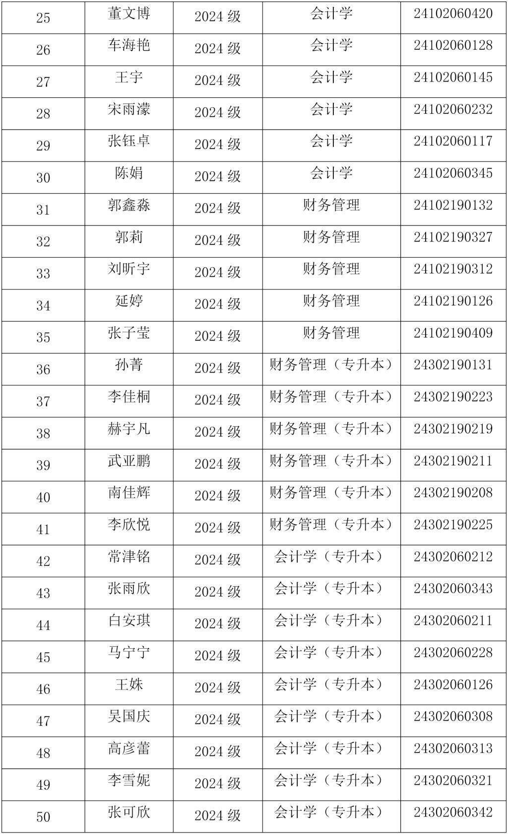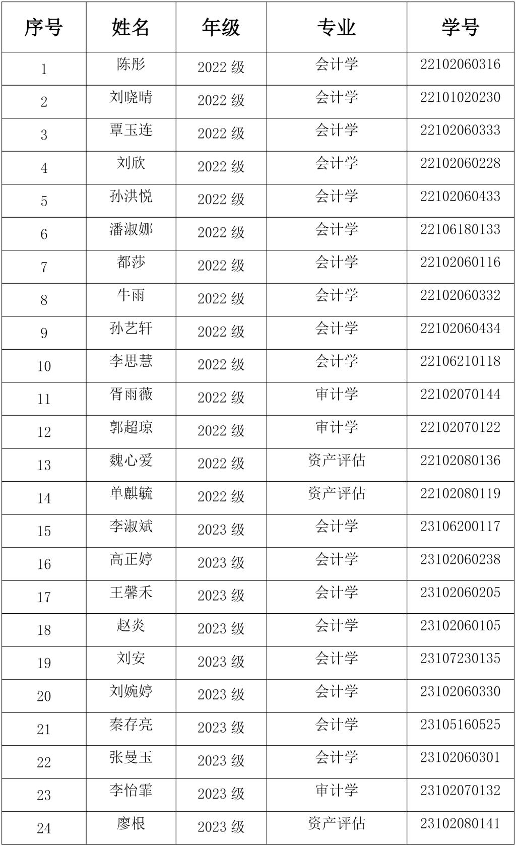 按照《财政部 教育部 人力资源社会保障部关于调整高等教育阶段和高中阶段奖助学金政策的通知》(财教〔2024〕181号)、《财政部 教育部 人力资源社会保障部 退役军人部 中央军委国防动员部关于印发<学生资助资金管理办法>的通知》(财教〔2021〕310号)、《省财政厅 省教育厅 省人力资源和社会保障厅 省退役军人事务厅关于印发<黑龙江省学生资助资金管理办法>和<黑龙江省学生资助资金管理实施细则>的通知》(黑财规〔2025〕14号)、《关于做好2025年普通高校本专科生国家励志奖学金评审工作的通知》(黑教服〔2025〕43号)文件要求及《哈尔滨金融学院学生奖励办法》(哈金院〔2020〕27号)的相关规定,会计学院国家励志奖学金评定小组根据学生个人申请、学习成绩专业排名和综合素质测评等情况,坚持公平、公正、公开的原则,经研究决定,拟推荐以下53名同学为会计学院2024-2025年度国家励志奖学金候选人,现予以公示,名单如下:
