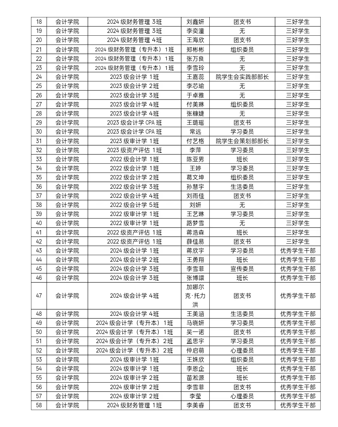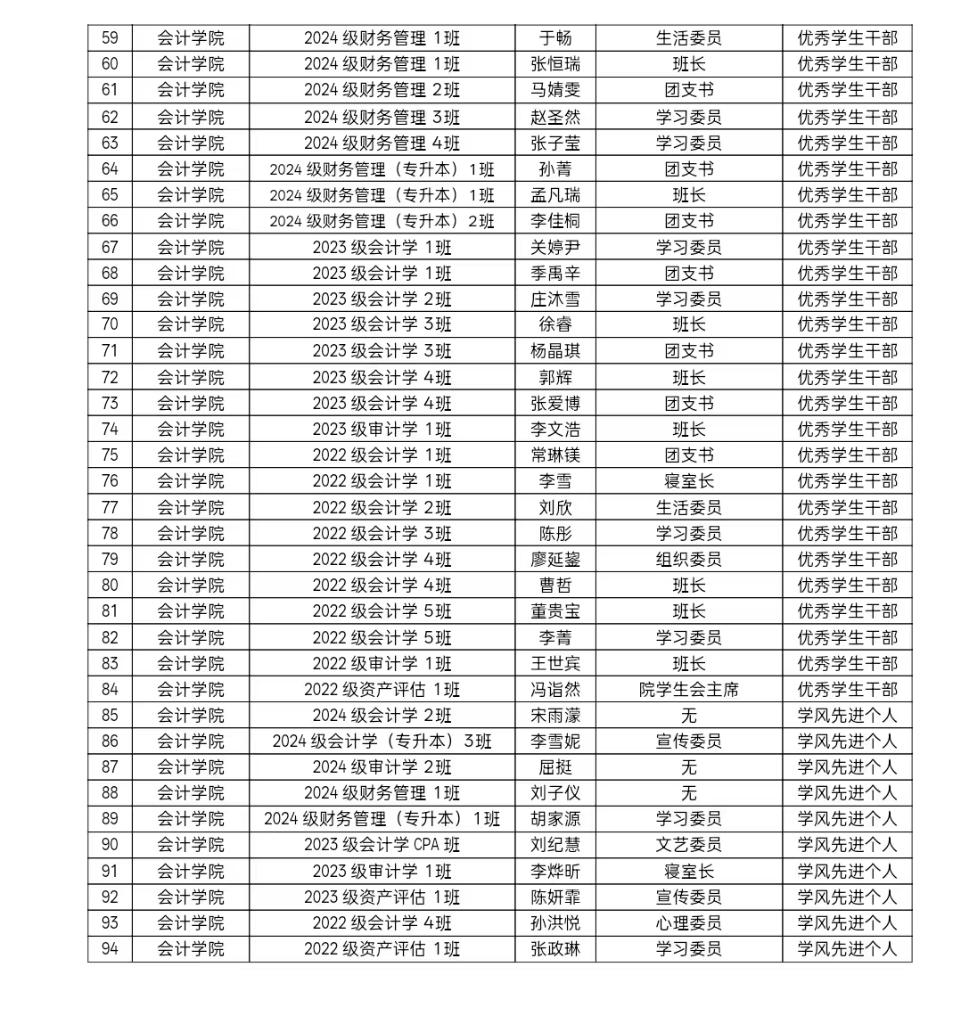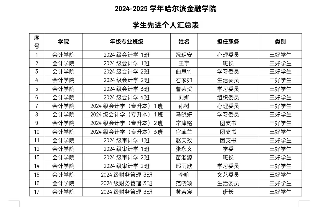 为深入落实“立德树人”根本任务,激励我校学生勤奋学习、努力进取,在德、智、体、美、劳等方面全面发展,建立良好学风,选树学生典型,教育引导广大学生积极向上,努力成才,依据《哈尔滨金融学院学生奖励办法》(哈金院〔2020〕27号)文件精神,结合《哈尔滨金融学院关于评选2024-2025学年校级学生先进个人、学风建设先进集体的通知》要求和相关规定,会计学院本着公开、公平、公正的原则,严格按照程序进行选拔,经班级民主推荐、院内复评,拟推荐以下94名同学为2024-2025学年哈尔滨金融学院学生先进个人,2个班集体为学风建设先进集体,现对评选结果进行公示,具体名单详见附件: