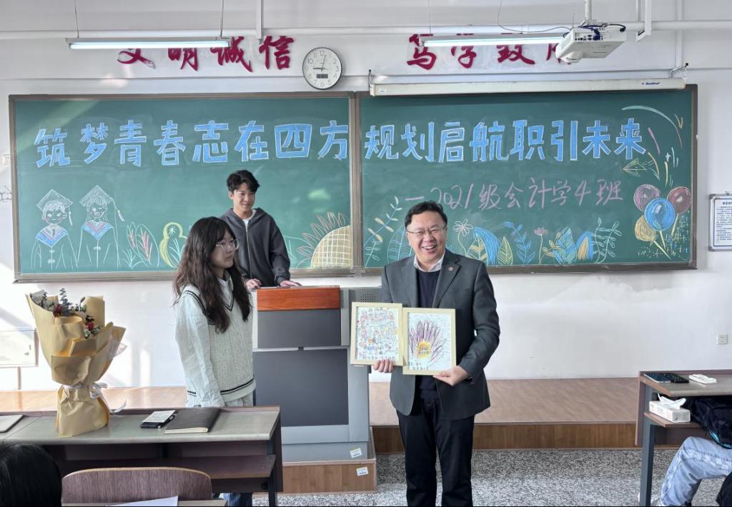班会伊始,班级团支部书记刘琪介绍了班级的基本情况,回顾了班级四年来在学科竞赛、校园文化活动、社会实践和志愿服务活动等方面取得的优异成绩。部分学生代表分享了自己大学生活的成长和收获。班会中特别设置了“邮寄梦想”环节,同学们在明信片上郑重地写下自己未来职业目标将梦想卡片投入信箱由辅导员寄存。这些“梦想”信件将在2025年同学们毕业时被取出,以此激励自己为实现梦想砥砺奋进。