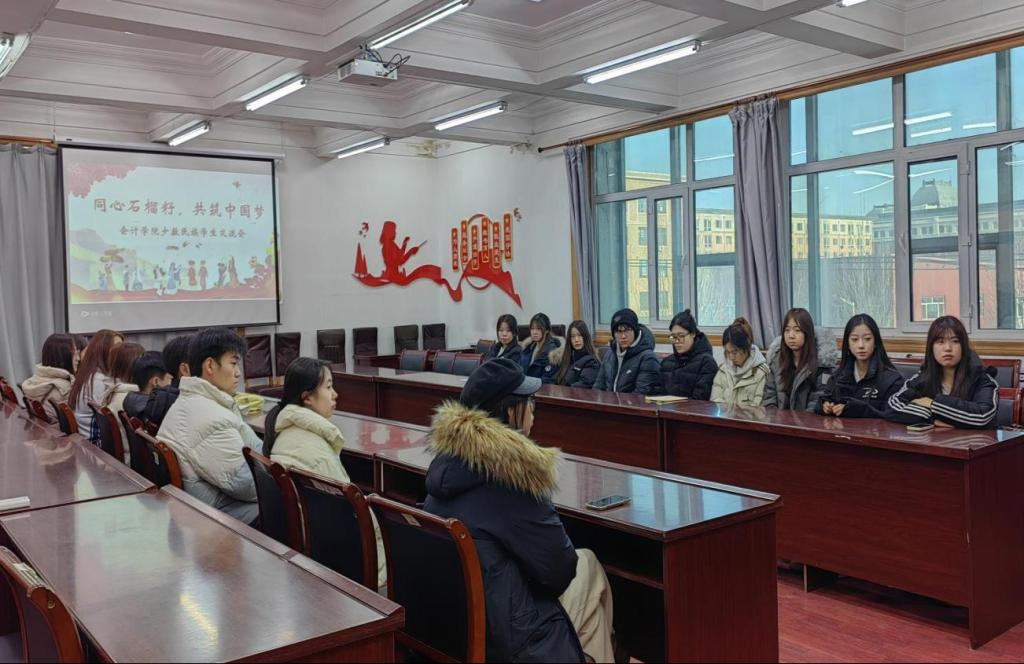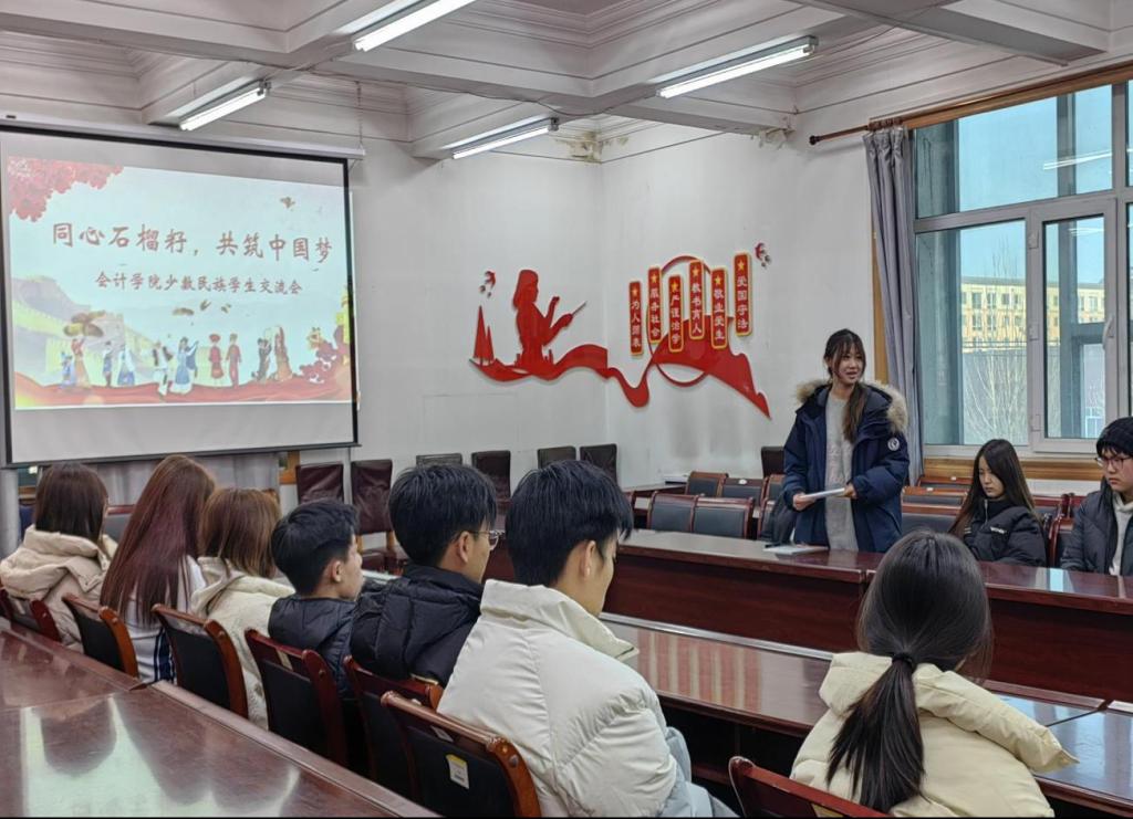 为铸牢中华民族共同体意识,深入了解少数民族学生的学习和生活情况,进一步加强学院学风建设,会计学院于2024年12月6日在会计楼309室召开少数民族学生学习交流会。会计学院党总支副书记白永雪,2024级辅导员于文丰、王雨欣和方馨及少数民族学生代表参加交流会。交流会由辅导员王雨欣主持。
