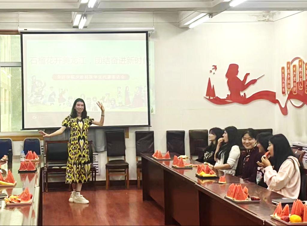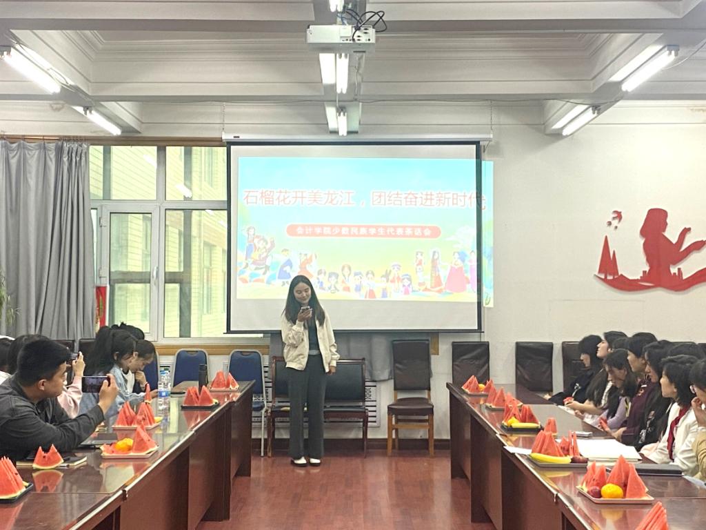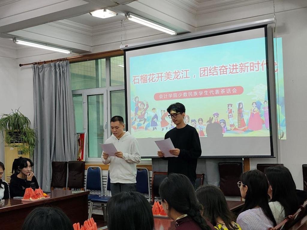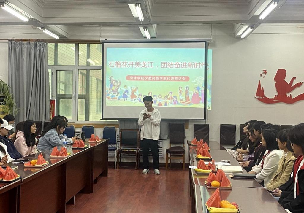 为深入贯彻落实党的二十届三中全会精神,全面贯彻落实中央、省委民族工作会议精神,根据关于印发《关于开展2024年度“石榴花开结同心 携手共筑中国梦”民族团结进步宣传月主题活动的方案》的通知要求,值此中华人民共和国成立75周年之际,我院于2024年9月28日在会计楼309室举办了“石榴花开美龙江,团结奋进新时代”少数民族学生代表茶话会。会计学院党总支书记闫慧兰、副书记白永雪、团委书记宫祥龙、各年级辅导员及少数民族学生代表参加此次活动。本次活动由会计学院辅导员方馨主持。