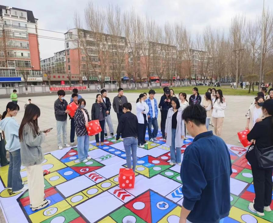 本次活动将经典飞行棋游戏与现代真人互动元素相融合。活动现场,主持人先介绍了飞行棋盘比赛规则,以红、黄、蓝和绿四种颜色,分成四支队伍参加比赛,按照游戏规则,投掷骰子得到点数6才能出发,团队需通过合作来完成挑战。游戏中,不仅有紧张刺激的投掷骰子环节,更有考验团队协作的道具抢夺战,各参赛人员为了能占得先机使尽浑身解数,有的飞速到达终点,有的一直站在起点看着对手“起飞”。同学们在愉悦的氛围中心情得到了放松、身体得到了锻炼,提高了自我信心和抗压能力。