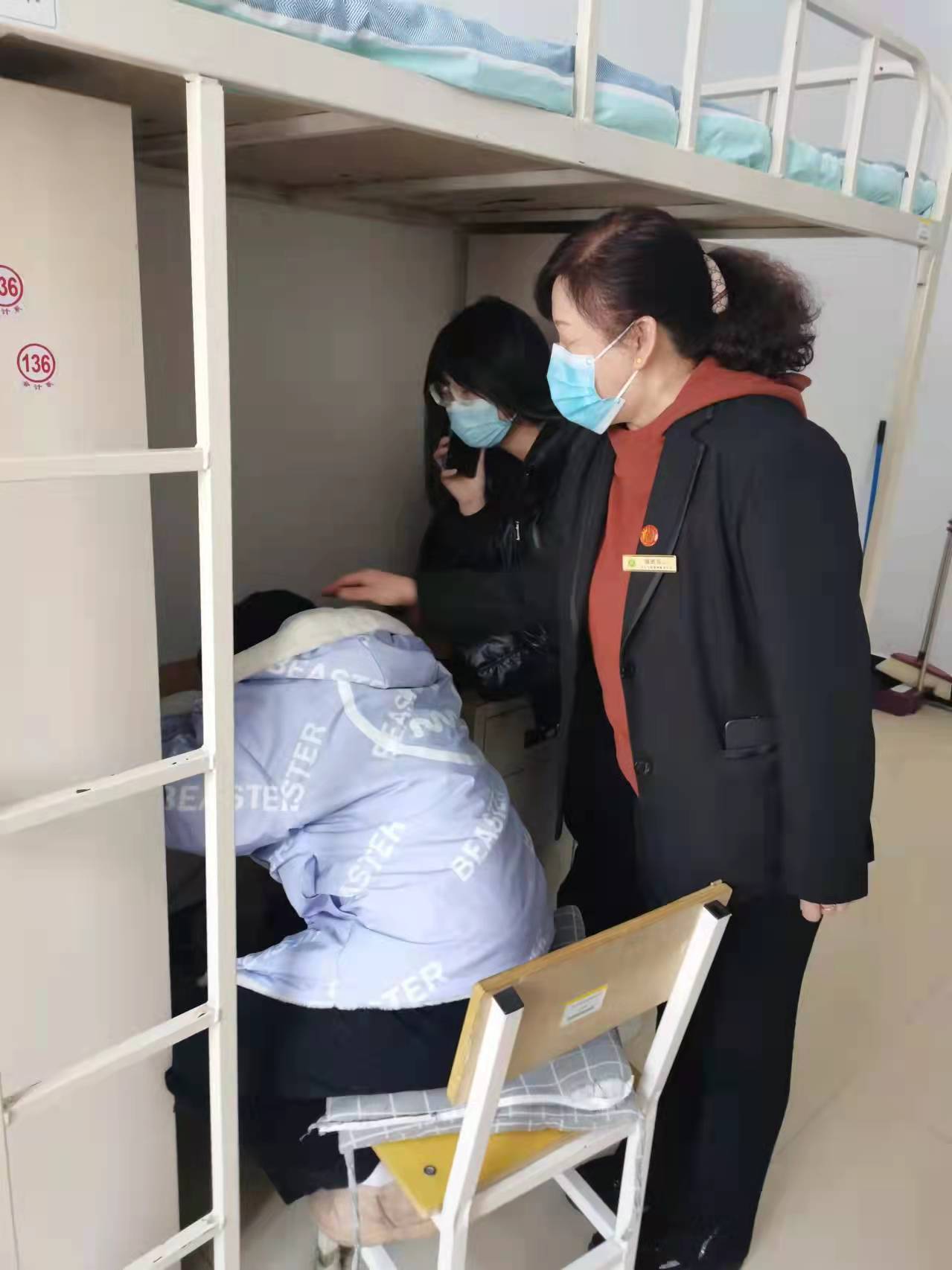 五公寓103寝室长(张可)发现(刘思霜)体温异常,寝室长(张可)立刻开窗通风并要求寝室所有同学佩戴好口罩,不得离开寝室。寝室长拨打辅导员老师(宫祥龙)电话,并联系公寓楼值班寝室阿姨(陈海霞),分别报告突发情况并做好同学们的安抚工作。