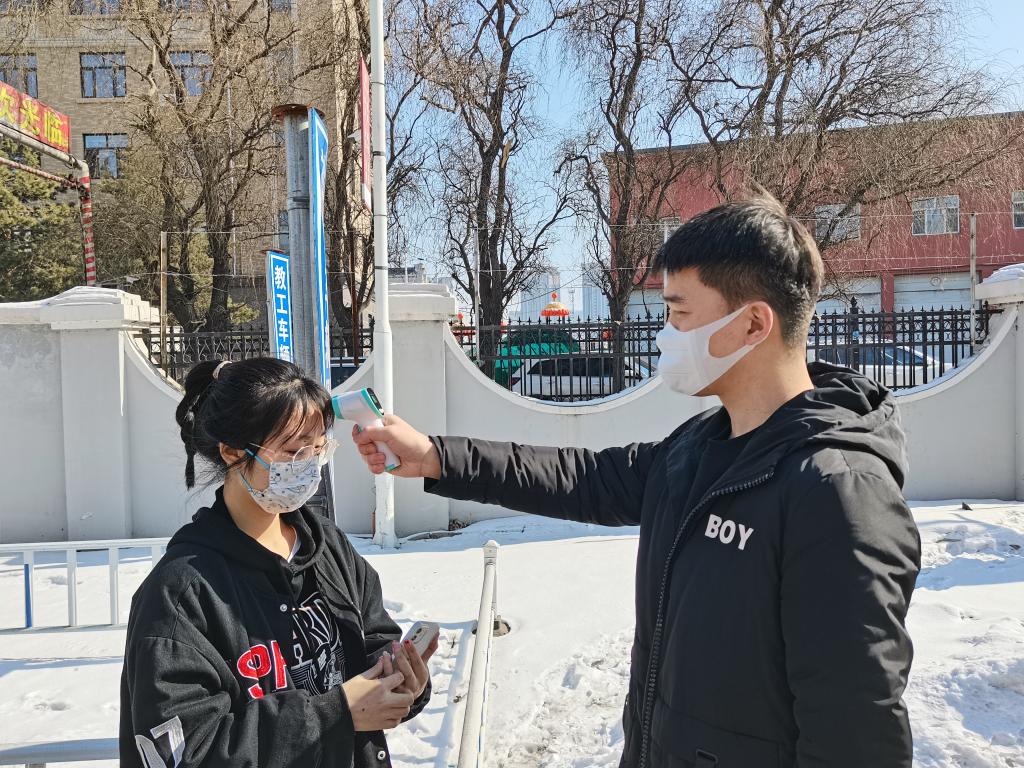 1名入口引导员(董明昔)组织返校的同学们保持间隔出示龙江健康码、行程码,出示钉钉对学生进行身份确认,通过红外线测温仪进行体温检查体温是否正常。