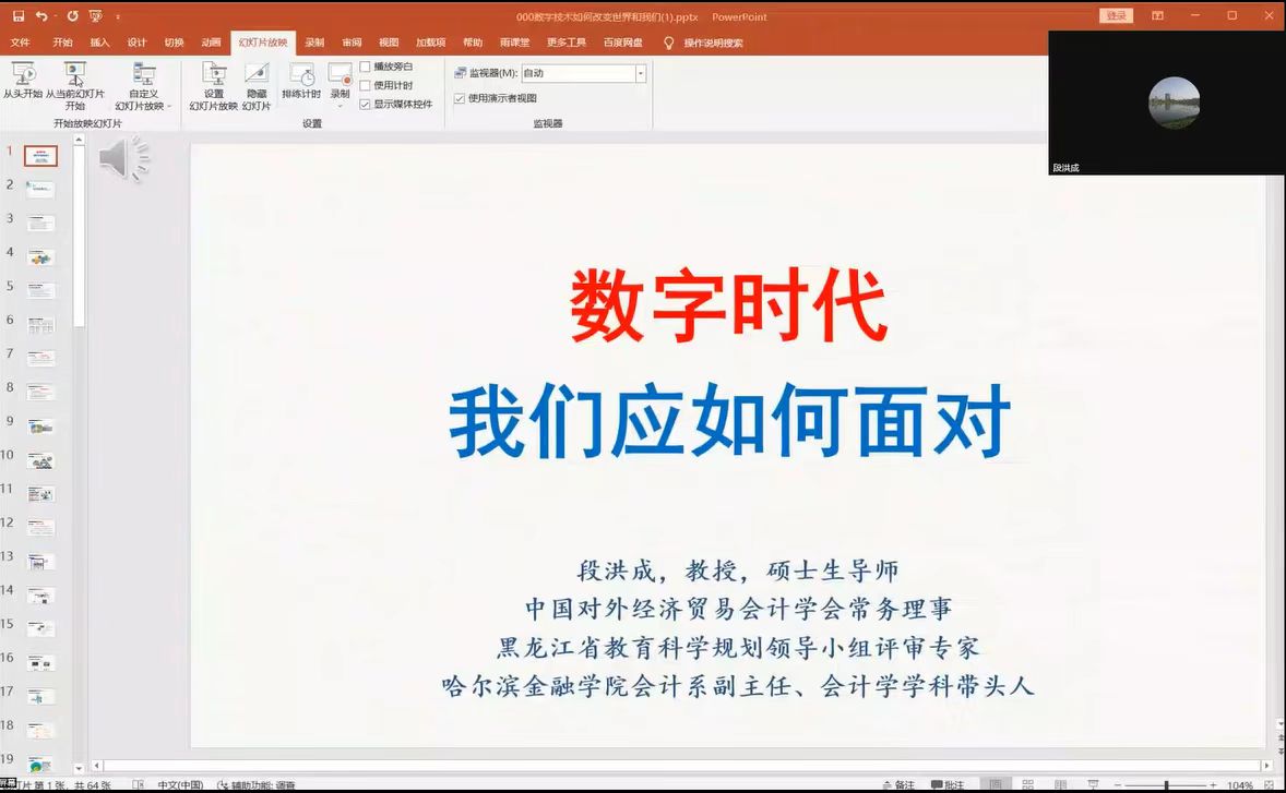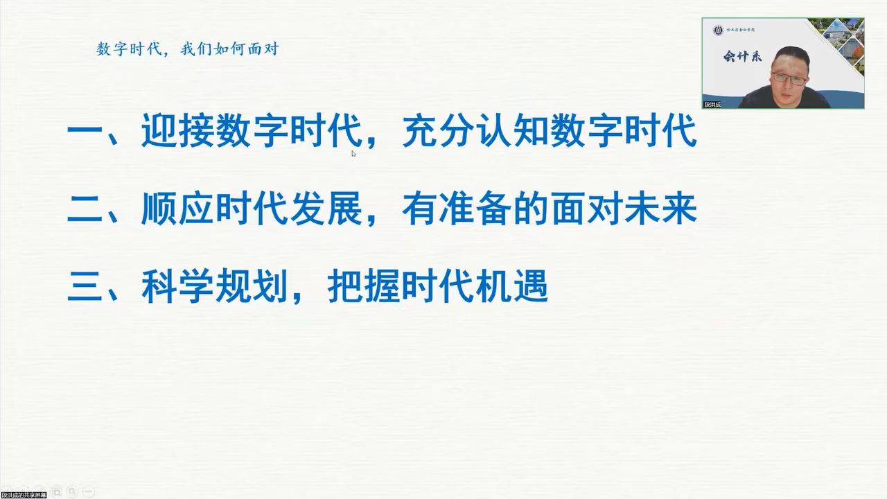 伴随着新一代网络信息技术的飞速发展,数字技术已经成为新工业革命的主要驱动力,是改变生产生活方式、产业变革升级的强大新动能,基于以上时代背景,2022年11月23日下午,会计系副主任段洪成教授在线上开展了题为“数字时代,我们应如何面对”的金苑讲坛讲座。学院教师及2021、2022级学生共200余人聆听了讲座。