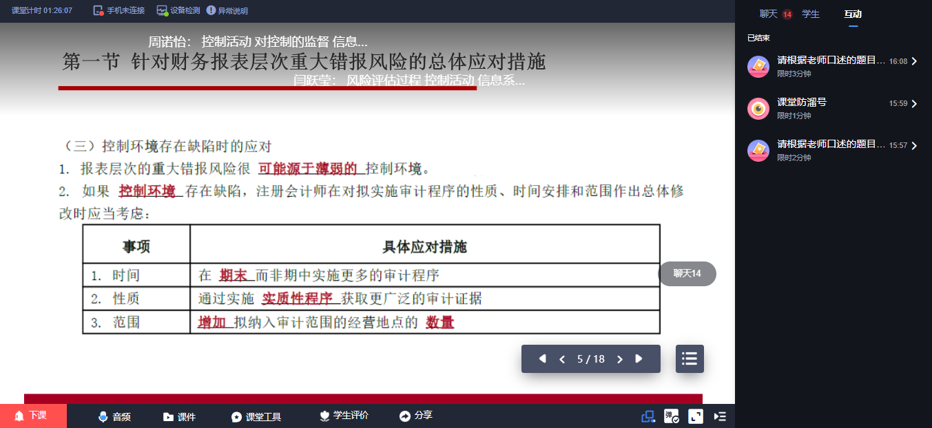 为培养学生家国情怀和正确的价值观,直播授课时持续融入思政教育。介绍一些学生感兴趣的新闻热点和实事案例,倡导审计人员的责任是面向公众的,审计从业者需要保持政治意识、大局意识,同时需要以底线思维、法治思维来规避错报和舞弊,最终以诚信的态度出具审计意见。培养学生健全人格,提升线上直播课堂的温度。