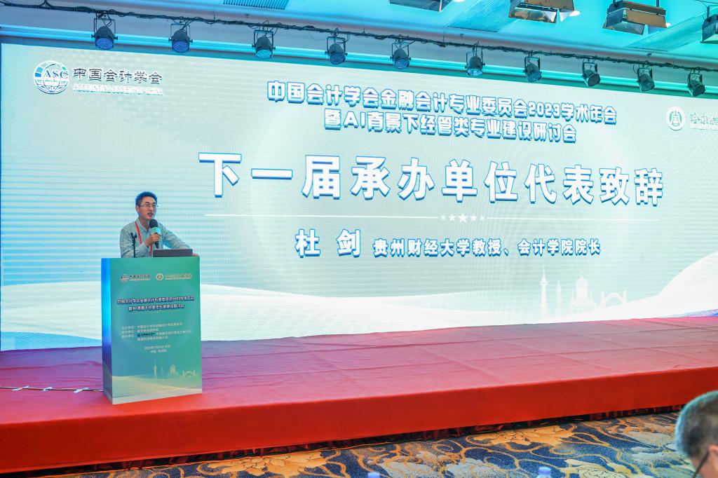贵州财经大学会计学院院长杜剑代表下一届年会承办单位致辞。他表示要以此次盛会为模板,努力办好中国会计学会金融会计专业委员会2024年学术年会,并向与会人员发出邀请。